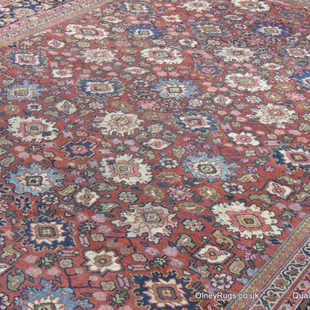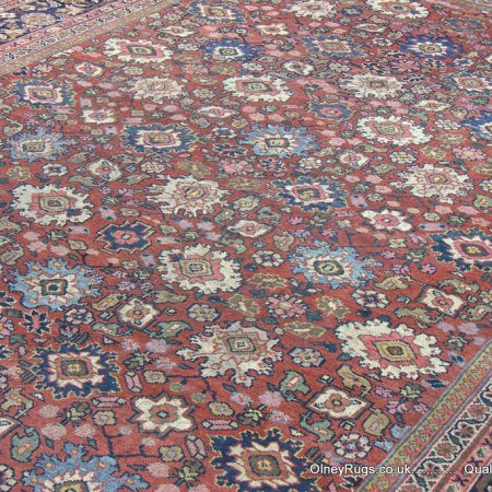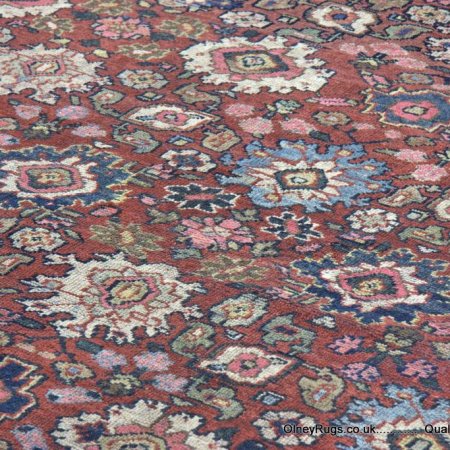 This is an old Persian carpet most likely from early 20th century. It's in good condition with a good pile all over. There are a few repairs that have been done well. The colours are beautifully mellow and it will add character to a cozy sitting room. On a wood or stone floor underlay will be essential to add comfort and preserve the rug. You can add this at the checkout.