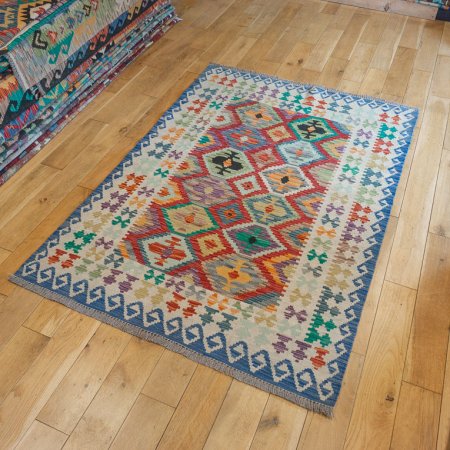 Mazar kilims are great value. They are well made by hand, flatweave wool construction and quite sturdy in use. They benefit from having no loose threads or knots on the back of the rug. This makes them double sided so when one side gets tatty you can flip them over. Customers buy these and put them to many uses. As floor or wall rugs, but also as table covers, picnic rugs, room dividers and so on. We use mazar kilims to cover the Kilim stools that we make.