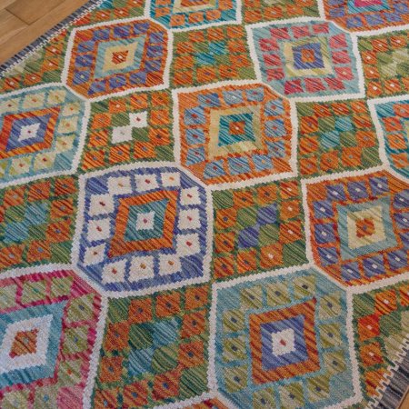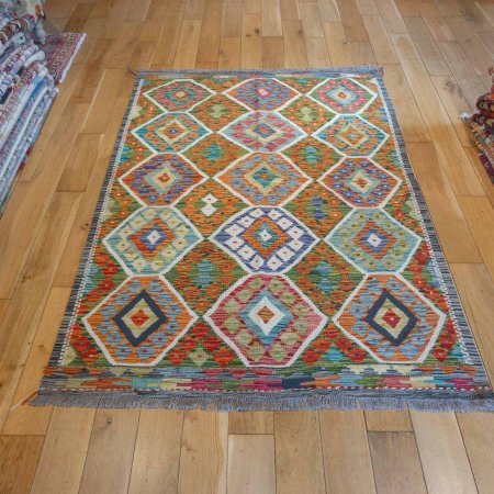 Mazar kilims are great value. They are well made by hand, flatweave wool construction and quite sturdy in use. They benefit from having no loose threads or knots on the back of the rug. This makes them double sided so when one side gets tatty you can flip them over. Customers buy these and put them to many uses. As floor or wall rugs, but also as table covers, picnic rugs, room dividers and so on. We use mazar kilims to cover the Kilim stools that we make.