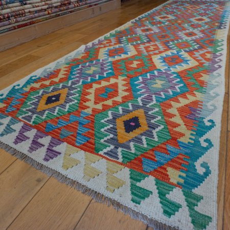This Hand-made Mazar KILIM dimensions are 307cm Length by 84cm Wide.