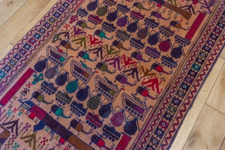 Baluch and Tajik weavers have always produced pictorial carpets, It is quite common to come across rug designs with a perspective representation of a mosque or other majestic building. During the Soviet occupation of Afghanistan carpets began to appear featuring images of guns, tanks and helicopters. Most are highly stylised owing to the coarse nature of the weaving. These rugs have become collectors items these days. Some of these rugs are finely woven to the extent that it's possible to make out the precise make and model of the hardware.