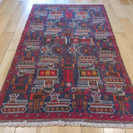 Baluch and Tajik weavers have always produced pictorial carpets, It is quite common to come across rug designs with a perspective representation of a mosque or other majestic building. During the Soviet occupation of Afghanistan carpets began to appear featuring images of guns, tanks and helicopters. Most are highly stylised owing to the coarse nature of the weaving. These rugs have become collectors items these days. Some of these rugs are finely woven to the extent that it's possible to make out the precise make and model of the hardware.