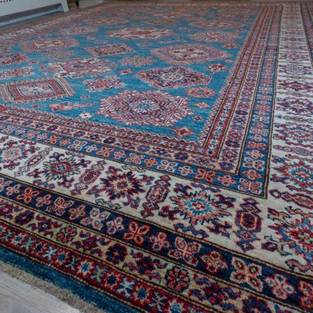 Our Kazak rugs are hand woven in villages of northern Afghanistan and finished (washing, pile trimming, fringing etc) in Pakistan. We buy them directly and we work very closely with the local designers to introduce new colours/patterns. Bold geometric designs in vibrant reds, blues and gold's are the hallmark of these amazing looking rugs. With a Kazak rug in your room you could turn the heating down a bit and save the planet. The hand knotted wool pile of this kind of rug is cut very low, about 2-3mm so for maximum comfort use our Comfort underlay.