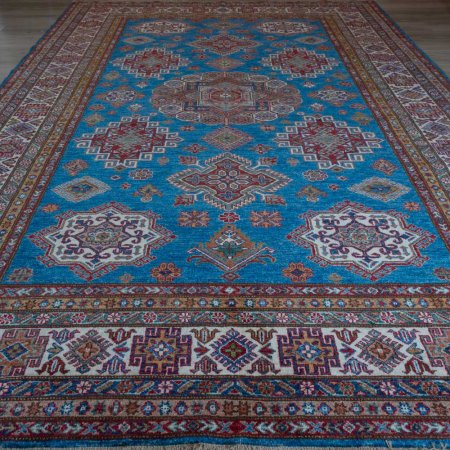 Our Kazak rugs are hand woven in villages of northern Afghanistan and finished (washing, pile trimming, fringing etc) in Pakistan. We buy them directly and we work very closely with the local designers to introduce new colours/patterns. Bold geometric designs in vibrant reds, blues and gold's are the hallmark of these amazing looking rugs. With a Kazak rug in your room you could turn the heating down a bit and save the planet. The hand knotted wool pile of this kind of rug is cut very low, about 2-3mm so for maximum comfort use our Comfort underlay.