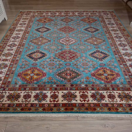 Our Kazak rugs are hand woven in villages of northern Afghanistan and finished (washing, pile trimming, fringing etc) in Pakistan. We buy them directly and we work very closely with the local designers to introduce new colours/patterns. Bold geometric designs in vibrant reds, blues and gold's are the hallmark of these amazing looking rugs. With a Kazak rug in your room you could turn the heating down a bit and save the planet. The hand knotted wool pile of this kind of rug is cut very low, about 2-3mm so for maximum comfort use our Comfort underlay.