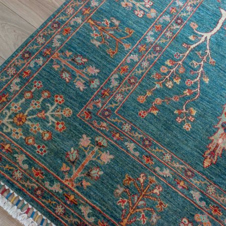 Our Khorjin rugs are inspired by the tribal bags representing magnificent vintage nomadic look with a modern feel and colours. They are produced by Afghani artizans. Weavers use very high quality wool finely hand woven on a cotton foundation. Pile is cut low and several washing processes provide silk like gloss and softness. Meticulous finish is clearly visible on the fringes or a sidecord. These rugs are extremely resistant and durable and thanks to the design they also look spectacular as a wall hanging.