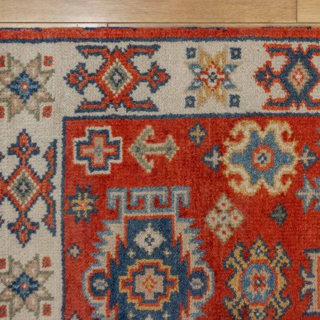 These great value Indo Kazak rugs are just marvelous.There are not many left of this shipment and the next is a few months away. Hand woven in India with a wool pile knotted on to a strong cotton foundation. The nice chunky texture makes them soft and springy to walk on.