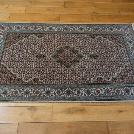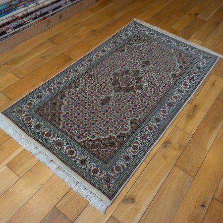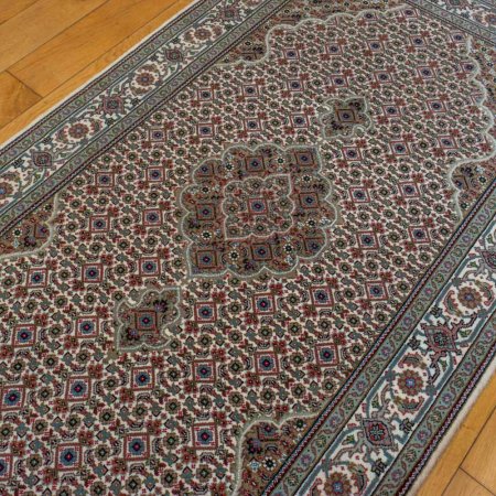 Carpet weavers in India are highly skilled at reproducing accurate copies of classic Persian designs. This rug does just that. A carpet that mirrors exquisite Persian Tabriz Mahi weaving. Impossibly fine knotting is used to create the intricate milleflleur design which is accented by weaving cream silk highlights in to the wool pile.