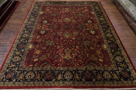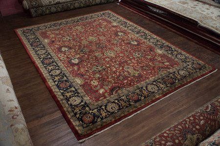 These beautiful rugs are hand woven for us in Bhadoi, India. Traditional Persian designs are faithfully reproduced using the finest millspun New Zealand wool. Painstakingly knotted in fine 14/14 quality. The finished rug is washed to give a lustrous patina so that each colour reflects ambient light to its maximum. These rugs are extremely soft to the touch and are often compared to silk carpets. In contrast to silk however, these rugs will be tough and resillient even in heavy wear areas. We keep a number of these rugs in stock and we are also able to make them in any size. Please ask for more information. We regularly see this amazing supplier in India overseeing every stage of the production, emphasizing on quality and pristine finish.