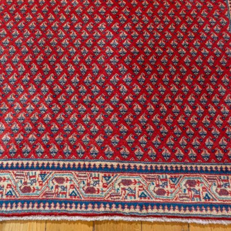 These repeating design rugs are ideal if you don't want the rug to dominate the furnishings around it. Originally hand woven in Arak (Western Iran). Mir rugs are also known as 'Seraband'. The pattern is repeating Boteh motiffs that we call the Paisley pattern. Very popular choice for dining or sitting rooms. Hand knotted wool pile and strong cotton foundation makes them incredibly durable in every day use. Occasionally they have central medalion but we try to stock them in all over design making them different to the traditional Persian look.