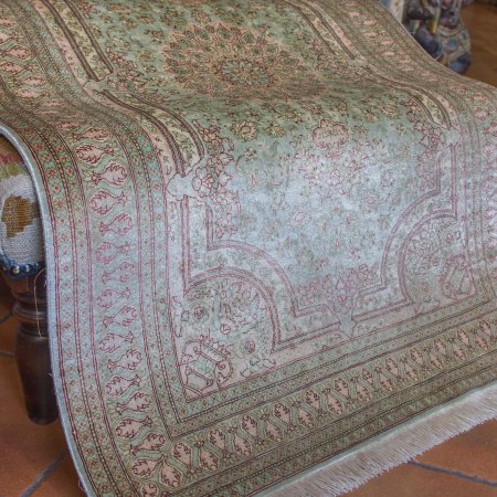 In Iran, Qum is known as the Holy city. It's also called Qom or Ghom. It is an important thological centre and many Iranians go there to visit the many religious sites and monuments. Worldwide the city is famous for the production of pure silk hand woven rugs like this one. These highly valued rugs are fasinating marvels with complex highly detailed designs. Search for Kashan Silk to see similar rugs