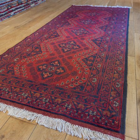 If you already own an Afghan rug you will be familiar with the traditional red and black format of the Nazhat and Khan Mohamadi style of carpets. The hand knotted pile of these rugs is wool and quite often the warp and weft are wool as well. Robust rugs at a reasonable cost. Great value. Khan Mahomadi rugs like this have wool that is lustrous and a glowing colour. Suitable for any location.