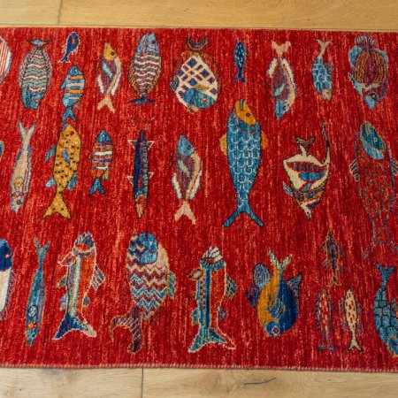 Lovely background colour of this fish design tribal Khorjin rug. Very unusual. Great wool and weight.
