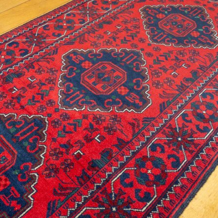 Kundoz rugs are hand woven in villages in Kunduz province - northern Afghanistan. Similar all over design to Khan (Khal) Mohammedi rugs however they are finer - hence more sophisticated details and finish. Soft high quality wool is used providing velvety feel. Kundoz rugs foundation is still cotton but overall quality wise they remind the finest in the range - Begique rugs but for a fraction of the price. Great choice for dining room, sitting room - very forgiving with red wine accidents!