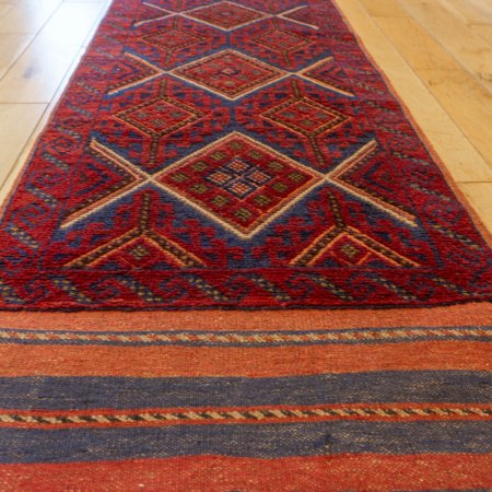 Mushwani rugs are a tetxile art form that combines flatweave and pile carpet weaving techniques. The varied texture is very eye catching and adds interest to any room. They also make beautiful wall hangings especially if well lit to show the bas-relief texture.